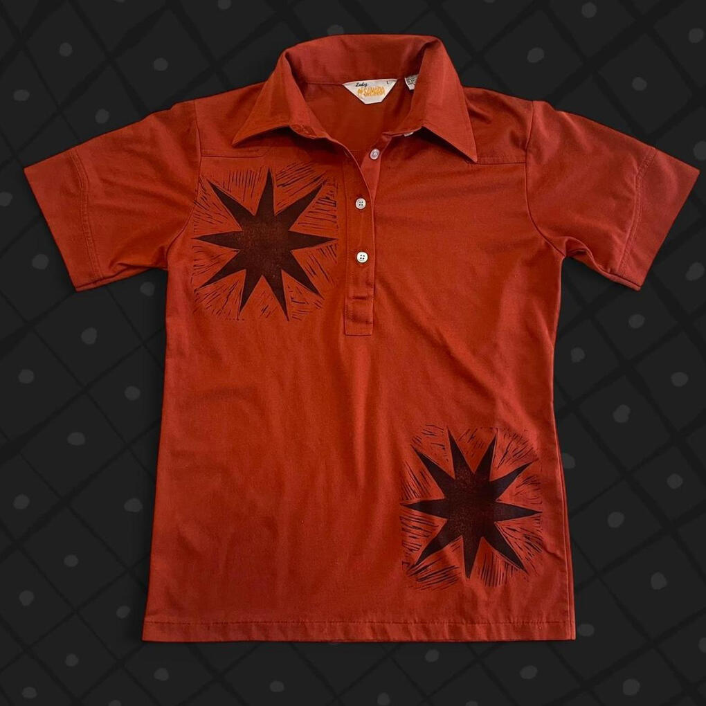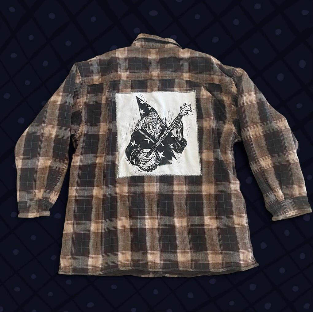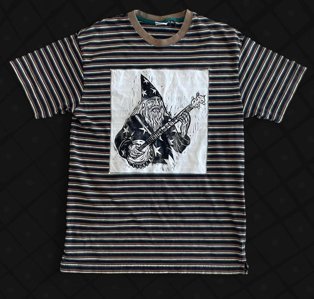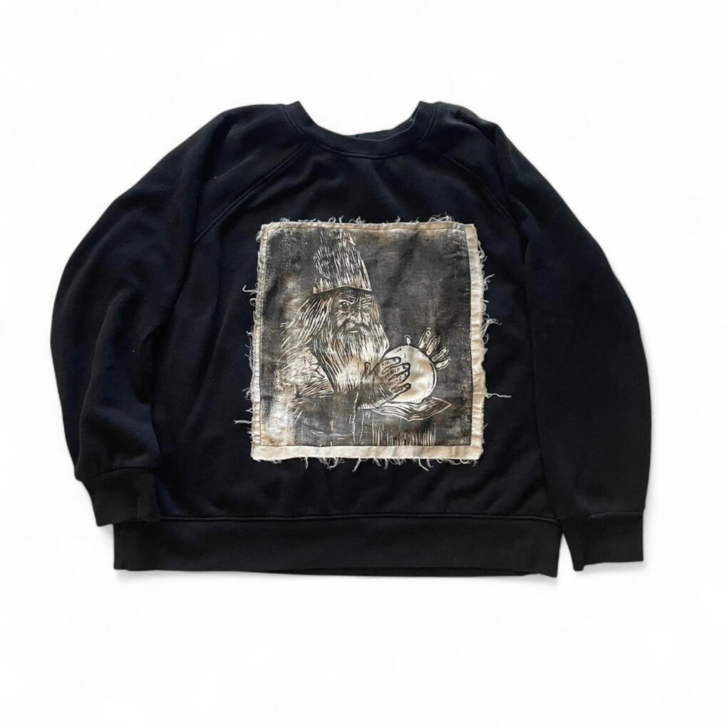 Clothes with hand-printed artwork either sewn or printed directly onto the garment. All clothes are sourced second hand to divert them from the landfill.
