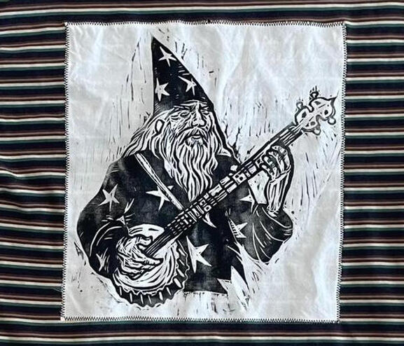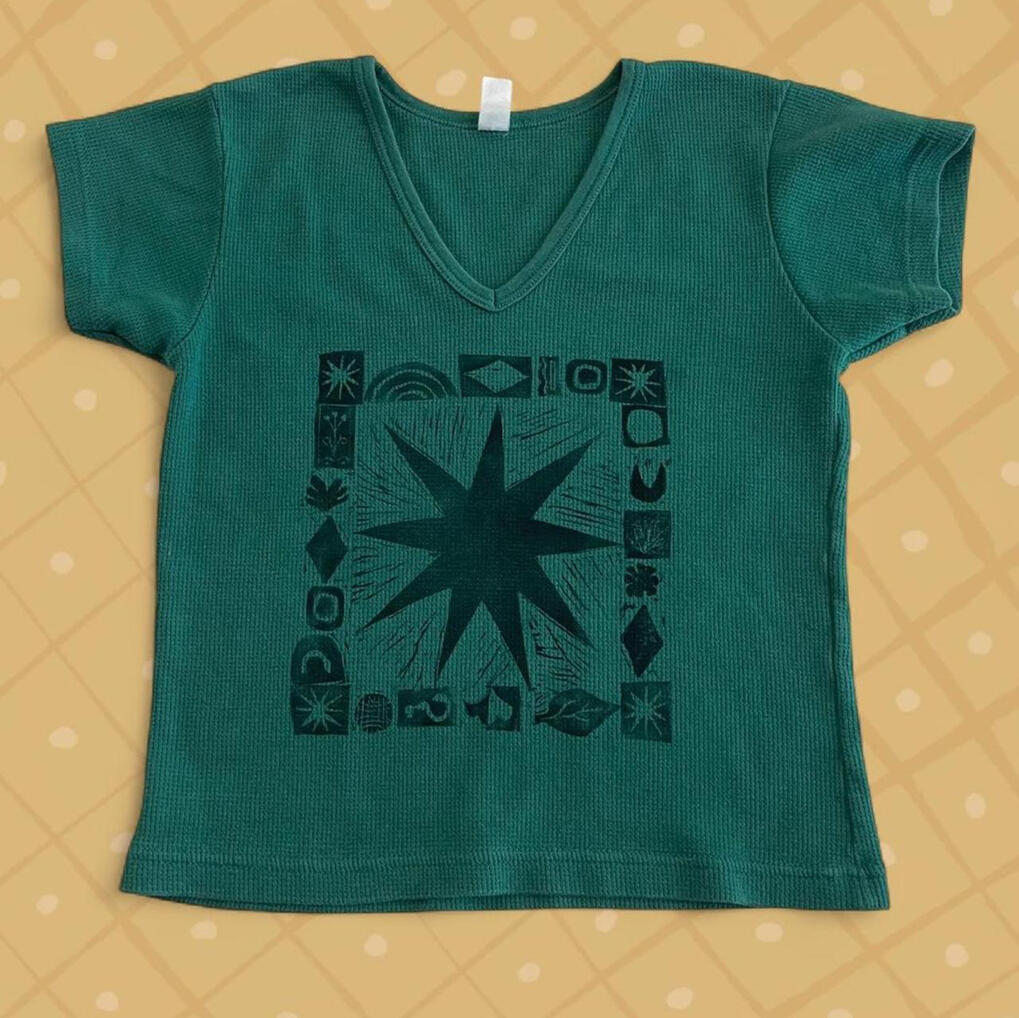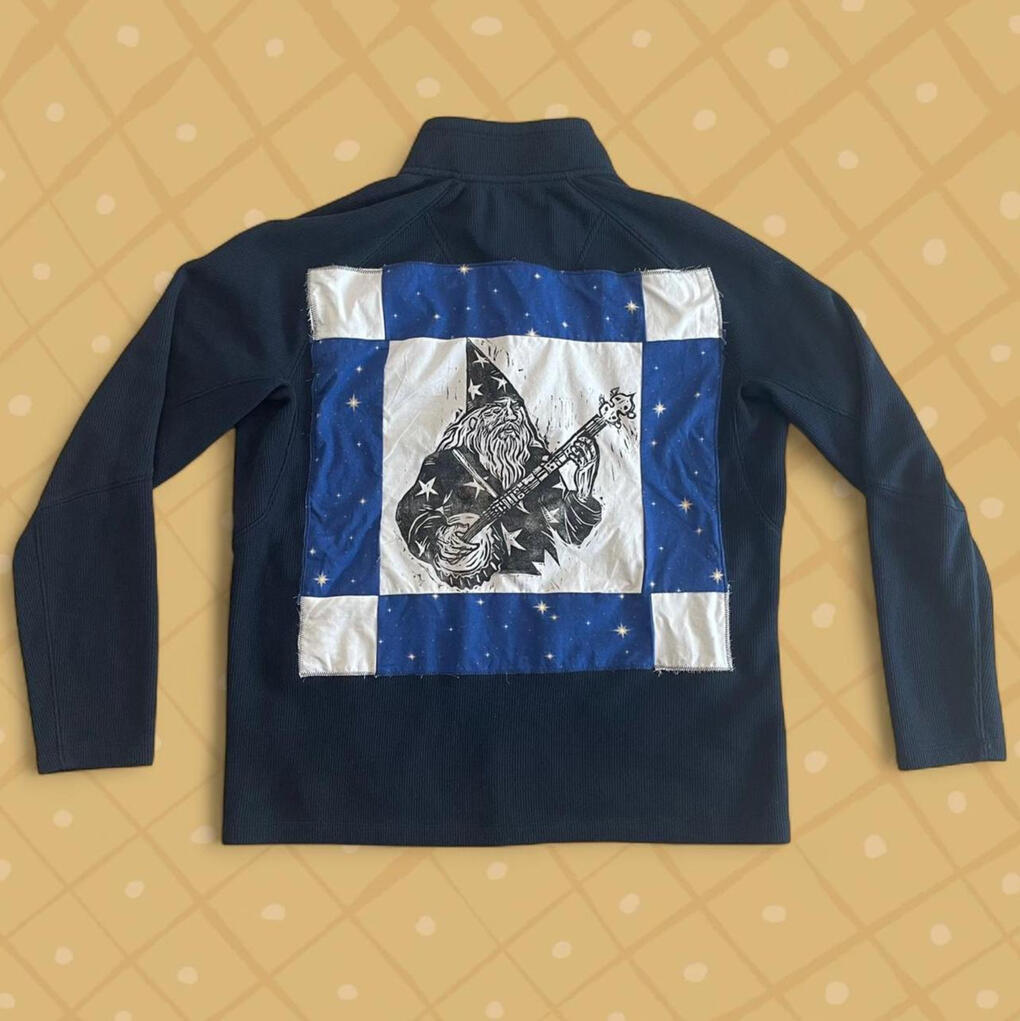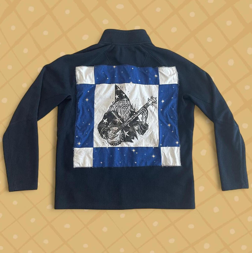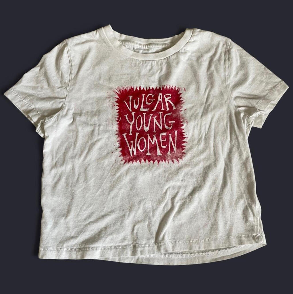 Clothes with hand-printed artwork either sewn or printed directly onto the garment. All clothes are sourced second hand to divert them from the landfill.