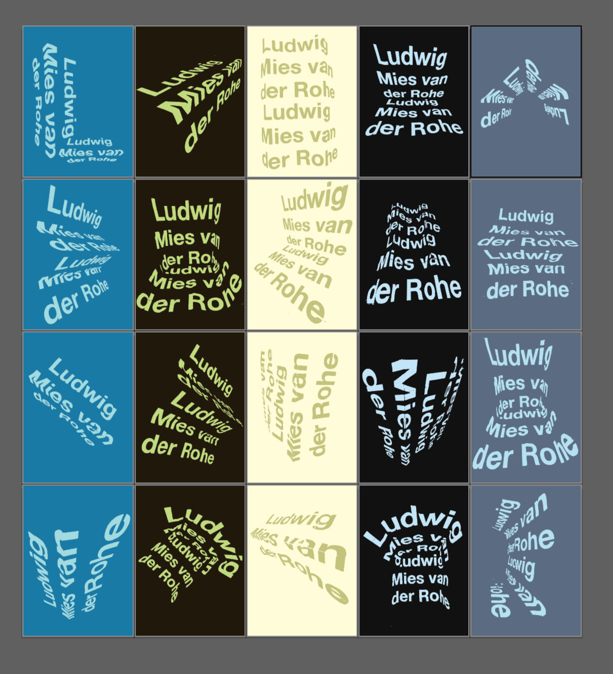 Initial typography compositions and color schemes.