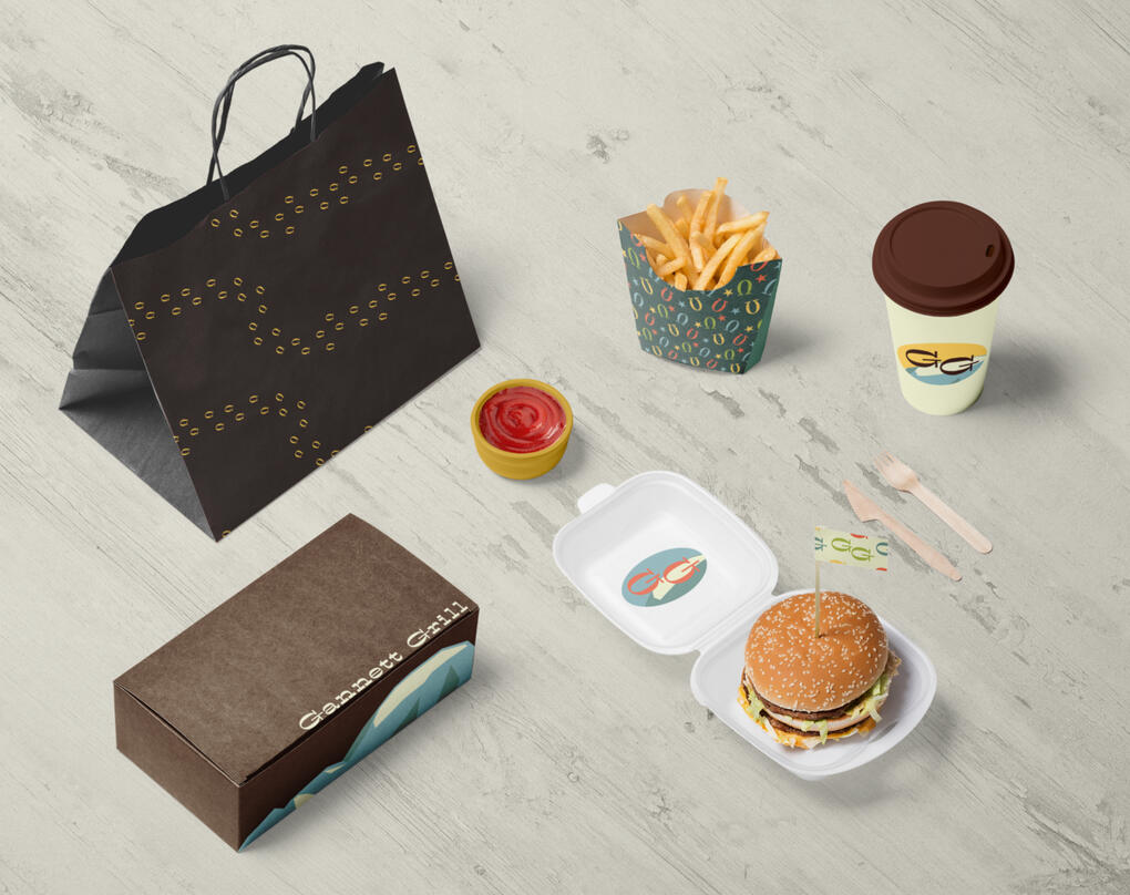 Logo variations and mockups for packaging and other items.